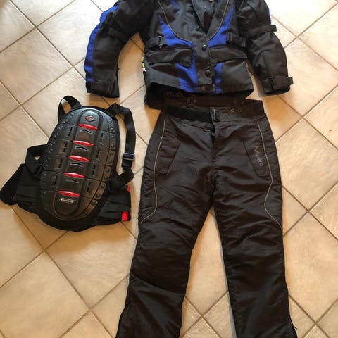 Outtrek motorcykeljakke og bukser sæt i sort tekstil. Jakken har aftageligt quiltet inderfor, justerbare stropper i talje og ærmer samt flere lynlåslommer. Der er refleksdetaljer på for- og bagside for øget synlighed. Indvendigt ses lommer til beskyttelsesindlæg. Bukserne er matchende i sort tekstil med lynlåse og forstærkede knæpartier. Sættet er egnet til kørsel i varierende vejrforhold. Brugt få gange af mine kone