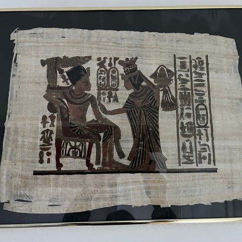 Billede med motiv af en egyptisk farao, udført i dæmpede blå, grå og rosa nuancer. Figuren er vist i hel figur med hieroglyflignende mønstre på kroppen og traditionel hovedbeklædning. Værket er indrammet i en profileret guldfarvet ramme. Egnet til ophængning i stue, gang eller kontor. Mål og materiale er ikke oplyst.