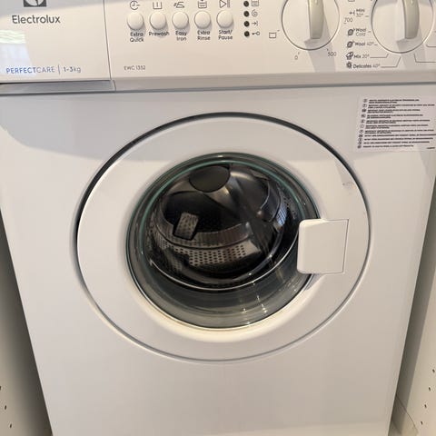 Electrolux kompakt vaskemaskine, frontbetjent model i hvid. Maskinen har drejeknap til valg af vaskeprogrammer og separat drejeknap til centrifugeringshastighed op til 1300 omdrejninger. Betjeningspanelet har flere knapper til funktioner som f.eks. temperatur- og programvalg samt LED-indikatorlamper for programstatus. Velegnet til almindelig husholdningsvask med forskellige programmer til hverdagstøj og mere skånsom vask. 50 cm bred, 52 cm dyb, 67 cm høj. Passer i lille badeværelse eller køkken, fx under køkkenbordpladen. 1300 omdrejninger/minut. Skal hentes i rækkehus i Solrød i stueplan. Er ikke særlig tung, vejer iflg. producenten 53 kg, dog lidt mindre fratrukket emballagen.