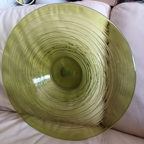 Rundt glasfad med blåtonet, slebet mønster. Fadet har rillet kant og dekorative felter i bunden med geometriske og bladformede motiver. Velegnet som serveringsfad til kager, frugt eller snacks, eller som dekorativt fad på bord eller reol.