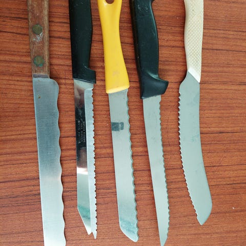 Selve kniven har et bølget skær, hvilket er typisk for en brødkniv.