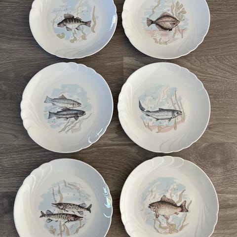 OFFENBACH FISKETALLERKENER, B&G OFFENBACH, FISKETALLERKENER, FROKOSTSTR. 21.5 cm, 1, sortering, 7 forskellige. Pr stk kr 235 og fast pris. Sælges en eller flere efter ønske. Der er nr 1 Sild,nr 3 Rødspætte, nr 4 Gedde, nr 6 Torsk, nr 8 Aal, nr 9 Aborre, nr 10 Makrel,