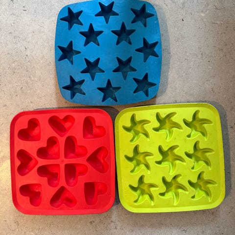 hjerteformede isterningebakker i silikone. Sættet består af tre bakker, to i grå og én i pink, alle med hjerteformede rum. Bakkerne er velegnede til frysning af isterninger, små desserter eller andre frosne portioner. Fremstillet i fleksibel silikone, som gør det nemt at få indholdet ud af formene. Den pinke er fra Ikea de to andre er ukendte.