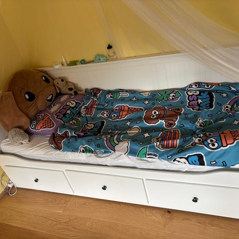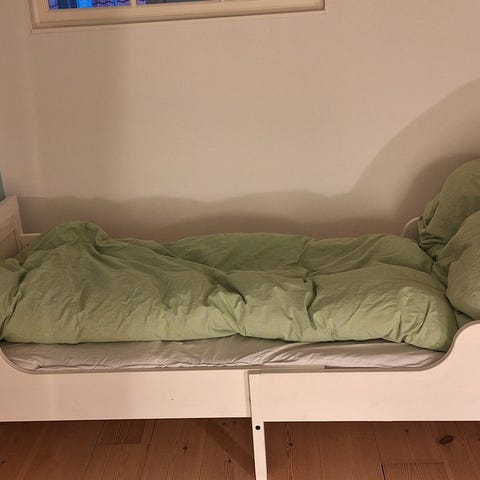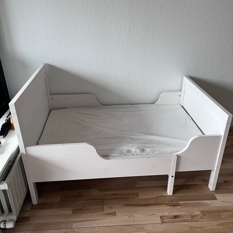 IKEA sovesofa i hvid med integrerede opbevaringsskuffer under sengen. Sengen er velegnet til ungdomsværelse med den smarte hjørnegavl, der fungerer som hyggehjørne. Sengen har en enkel, rektangulær ramme og en løs gavl, som kan monteres efter behov. Overfladen er glat og nem at rengøre. Passer til standard enkeltsengsmadras (mål afhænger af den konkrete model), der medfølger 2 madrasser, den ekstra kan anvendes, når sengen er slået ud.