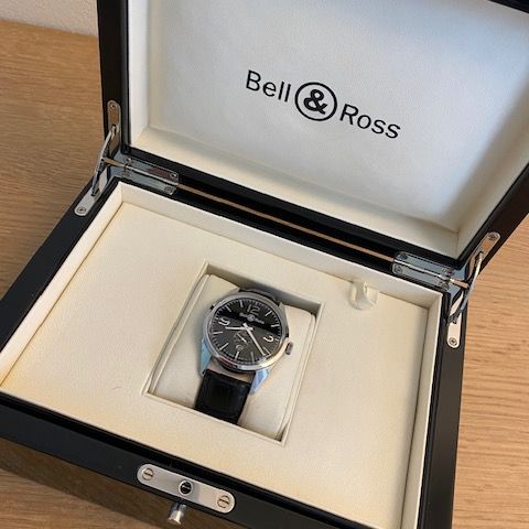 Herreur, Bell & Ross, Bell& Ross Herrearmbåndsur af pvc og 18 karat guld. Model Aviation. Ref BR01-94-s/r- 001. Mekanisk værk med automatisk optræk. Fra År. 2008 Sort Skive med hvide indeks og guld viser. Sort alligatorrrem med c-spænde af 18 karat guld original boks certifikat 3 extra remme og værktøj medgølger Fast pris