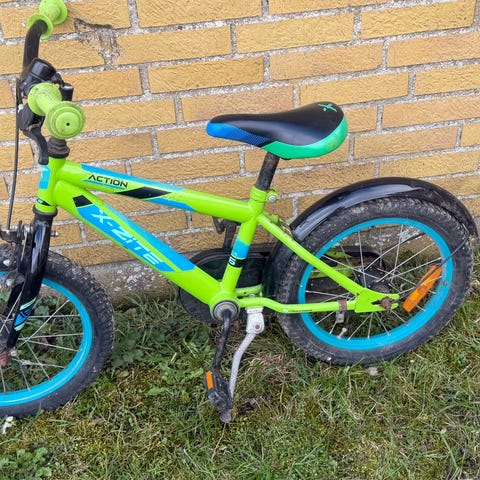 Børnecykel med 16" hjul i grøn og blå. Cyklen har støttehjulsfæster, bagagebærer, skærme og kædeskærm. Egnet til børn, der passer til 16" hjulstørrelse. Farvekombinationen er grøn ramme med blå og sorte detaljer.
