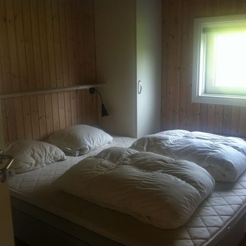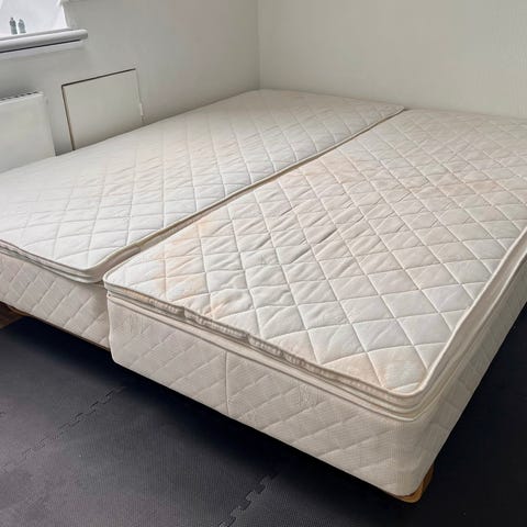 Boksmadras. 2 stk 90 gange 200.Sengen står på metalben og har en polstret madras. Velegnet som dobbeltseng i fx sommerhuset