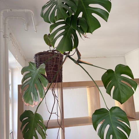 Stor fin Monstera plante med hvid potte og underpotte.