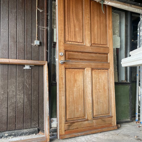 Brugt hoveddør i træ med karm.
