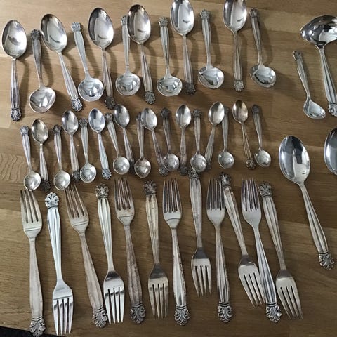NS ALP GAB Extra Vintage Nickel Sølv bestik Set "Vasa Sheaf Mitif". Sweden. Er i perfekt stand som der er seks af. Der er 5 gafler 6 sker 1 serveringssle og en sukkerske