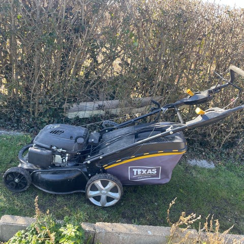 Texas benzindrevet plæneklipper i sort og gul. Plæneklipperen har fire hjul og håndtag med betjeningsgreb. Den er egnet til klipning af almindelige græsplæner i haven. Maskinen drives af en benzinmotor, og klippehøjden kan typisk justeres via hjulene eller et centralt håndtag, afhængigt af model. Velegnet til privat brug til vedligeholdelse af græsarealer omkring hus og have.