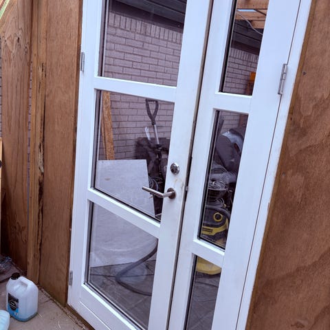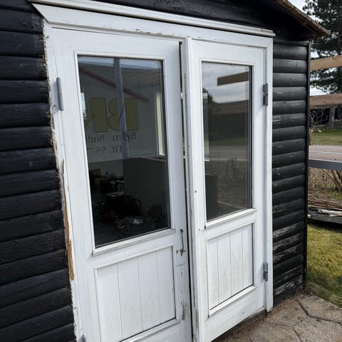 Dobbeltdør med glasfelter i sort ramme. Døren har flere glaspartier, herunder smalle felter i top og bund samt større midterfelter. Døren er hvid indvendig og lavet i plast Der er monteret greb og lås på den ene dørfløj. Velegnet som yderdør eller terrassedør, hvor der ønskes godt lysindfald gennem glaspartierne.Begge døre kan åbne , bredde 140cm højde 215 cm