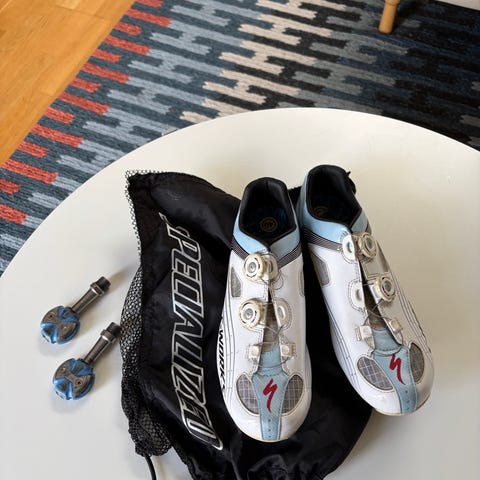 Specialized S-Works cykelsko i størrelse 39. Skoene er hvide med justerbare drejespænder på overdelen. Sålerne er stive og egnet til landevejscykling med klamper monteret under sålen. Der medfølger en opbevaringspose samt ekstra smådele til skoene. Velegnet til cyklister, der bruger klikpedaler og har brug for en let og stiv sko til træning eller landevejskørsel. Trænger til nye klamper. Men fungerer fint.