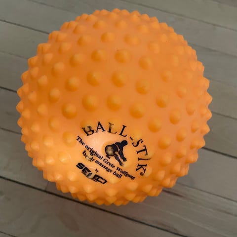 Select Ball-Stik massagebold i orange farve. Bolden har en nopret overflade, der er egnet til kropsmassage og muskelstimulering. Kan anvendes til selvbehandling af ømme muskler, opvarmning før træning eller generel afspænding. Velegnet til brug derhjemme, i fitnesscenter eller til fysioterapiøvelser.