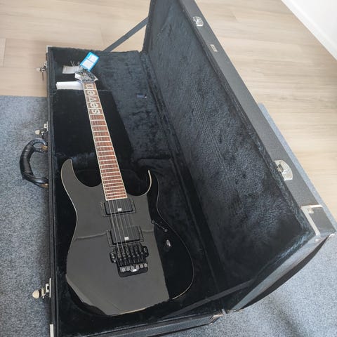 Ibanez elektrisk guitar i sort med hvid kant. RG-type mahogni krop.