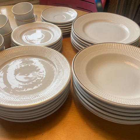Royal Copenhagen stel i hvidt porcelæn. Sættet består af forskellige dele, herunder tallerkener, skåle, kopper med underkopper samt serveringsfade og -skåle.