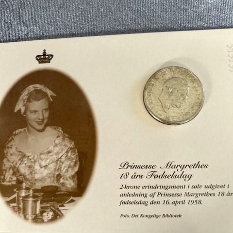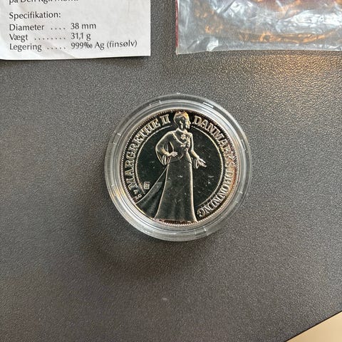 Sølvmønt til minde om Margrethes 50 års fødselsdag i kapsel.