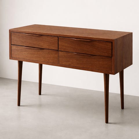 Charmerende kommode fra 70'erne i teaktræ med 4 skuffer. Nyistandsat. Kommoden er afvasket, slebet, grundmalet og slutmalet to gange med rulle I en miljøvenlig maling fra Fusion, I farven Champness. Skufferne er meget fine indvendig og kører som de skal, og er 10 cm dybe.