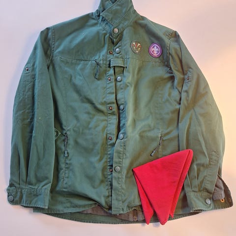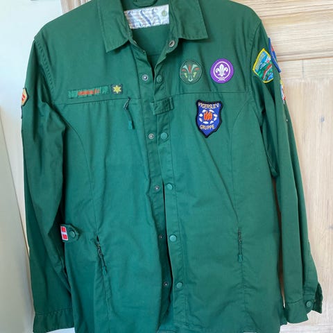 Grøn spejderjakke i str. 10/140. Jakken har gennemgående lynlås med knaplukning udenpå, flere forlommer samt mærker og emblemer på bryst og ærme. Egnet som uniformsovertræk til spejderbrug for børn omkring str. 140 cm. Der flg fleece trøje og tørklæde med ( lille brændemærke på fleece trøje)