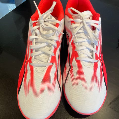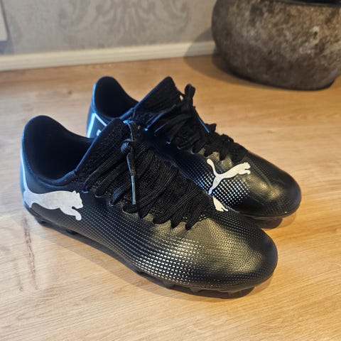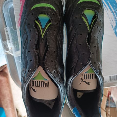 Puma fodboldsko i str. 41 (UK 7,5 / US 8,5 / 26,5 cm). Skoene er i en kombination af sort, blå og neongul med snørelukning. Overdel i syntetisk materiale og tekstilfor. Ydersål i gummi egnet til brug på hårde underlag eller kunstgræs. Velegnet til fodbold og anden sport, hvor der ønskes lette sko med god bevægelighed.