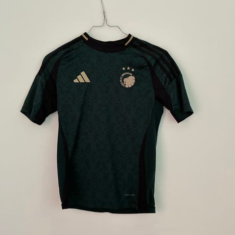 Adidas F.C. København fodboldtrøje til børn i størrelse 140 (9-10 år). Trøjen er hovedsageligt hvid med blå detaljer på skuldrene og sort halskant. På brystet er der Adidas-logo samt F.C. København-klublogo. Kortærmet model i let materiale, egnet til fodbold og anden sport eller fritidsbrug.