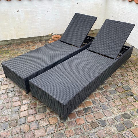 Sammenklappelige solvogne med sort polyrattan. Solvognen har justerbar ryglæn og medfølgende hovedpude. Den kan klappes sammen til en kompakt boksform for nem opbevaring. Velegnet til brug på terrasse, altan eller i haven som liggestol til afslapning udendørs. Hynder stort set som ny.
