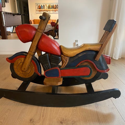 Gyngehest som knallert. Perfekt til den lille fartglade dreng. Laves ikke mere. Nypris 950kr.
