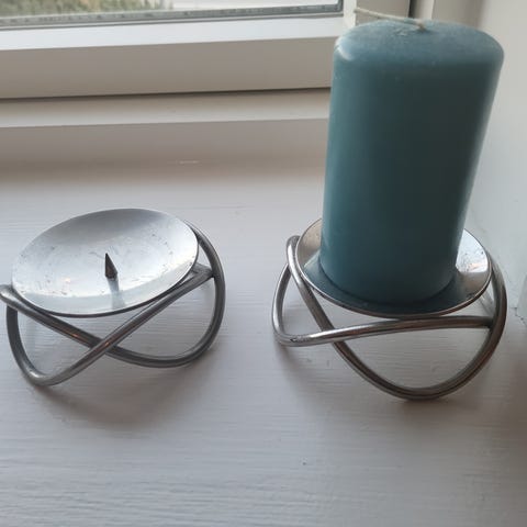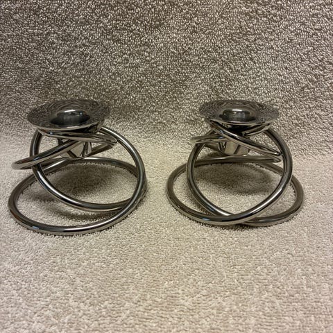 Georg Jensen gulvlysestager i rustfrit stål. Sættet består af tre skulpturelle stager i forskellig højde med organisk, buet form og rund fod. Overfladen er blankpoleret metal, egnet til bloklys eller større stearinlys. Velegnet som dekorative gulvstager i stue, entré eller andre opholdsrum.