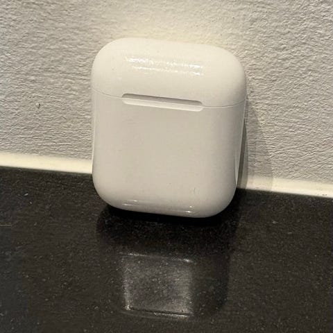 Apple AirPods trådløse in-ear høretelefoner i hvid. Modellen er fuldt trådløs og leveres med et kompakt opladeetui, der beskytter og oplader høretelefonerne under opbevaring. Høretelefonerne er designet til brug med Apple-enheder, men kan også tilsluttes andre enheder via Bluetooth. Velegnet til musik, opkald og daglig brug, hvor der ønskes trådløs lyd i et kompakt format.