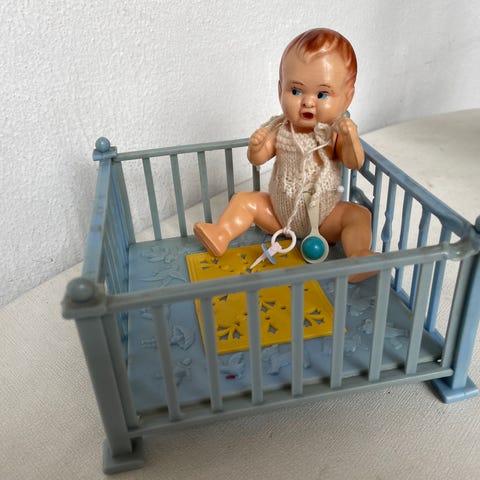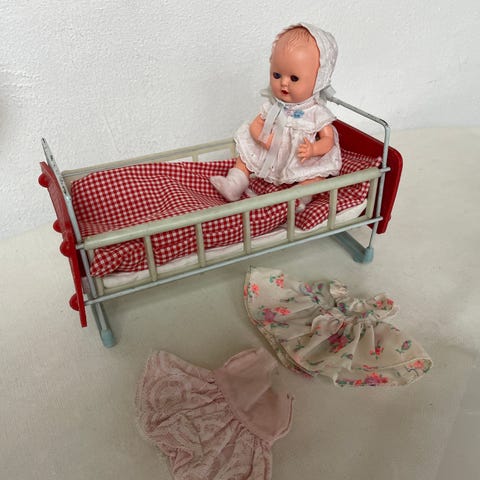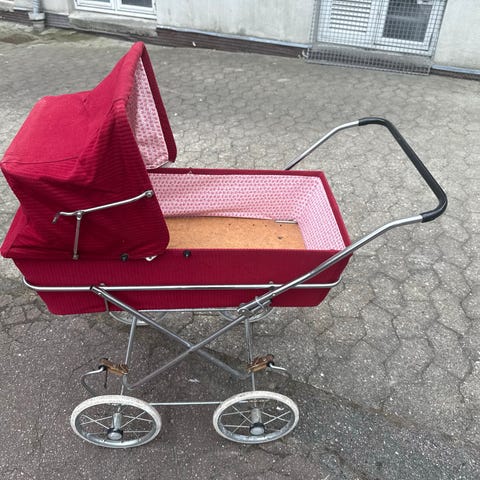 Dukke legetøjssæt med lille babydukke i stofpose, åben kuffert, rød plastbarnevogn med hvide hjul samt lille træhøjstol. Dukken er klædt i lyseblå kjole med prikker og blondekant. Sættet kan bruges som tilbehør til dukkekrog eller som samlerobjekt .,,,
