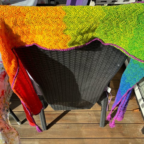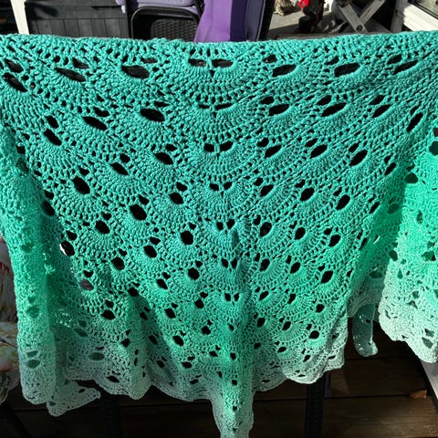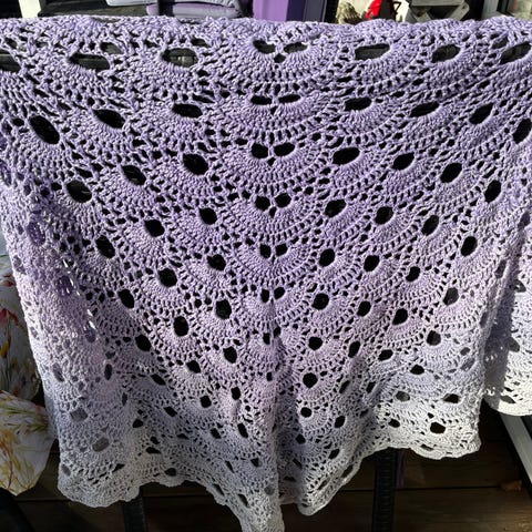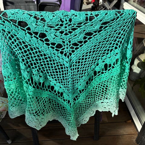 Håndlavet hæklet sjal i lyseblå, 100 % bomuld. Sjalet har et mønster med luftige masker og er trekantet med kvaster i hjørnerne. Velegnet som skuldersjal eller let tæppe til brug indendørs eller udendørs på kølige dage.