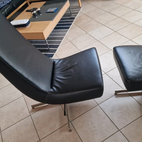 Lænestolen har dreje og vippe funktion og en medfølgende fodskammel