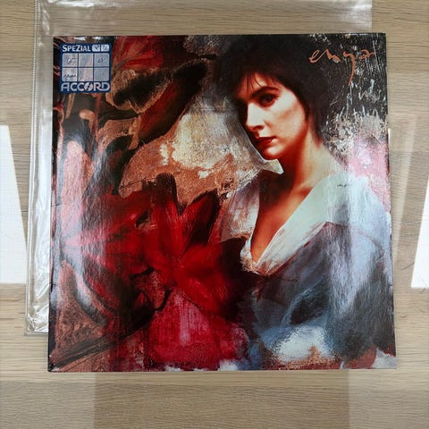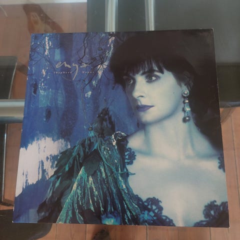 Enya Shepherd Moons lp. Vinylplade med albumtitlen "Shepherd Moons". Omslag med blåligt motiv og trykt trackliste på bagsiden. Pladen har centermærke med sangtitler og albumoplysninger. Egnet til afspilning på standard pladespiller til lp-format.
