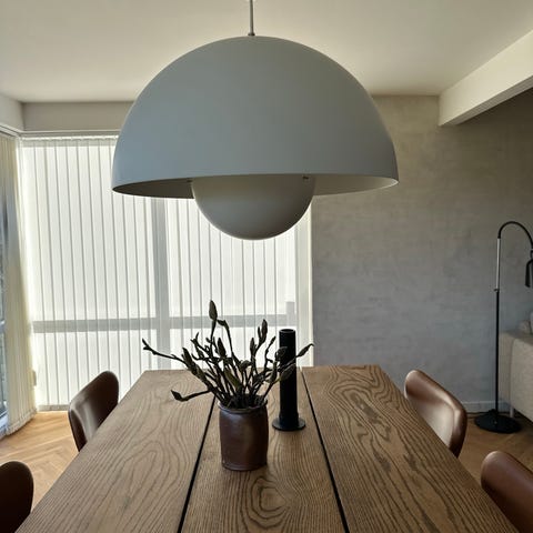 Verner Panton pendel i sort. Klassisk halvkugleformet loftlampe egnet til ophæng over spisebord, i stue eller køkken. Lampen giver nedadrettet lys og passer ind i mange typer indretning med sit enkle, tidløse design.