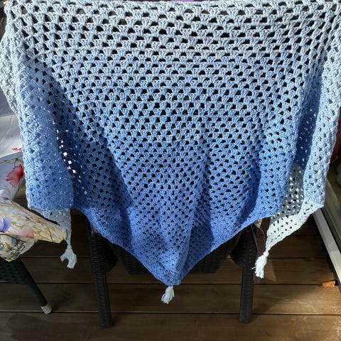 Smukt håndhæklet sjal med fin farveovergang fra lilla til lyser nuancer.