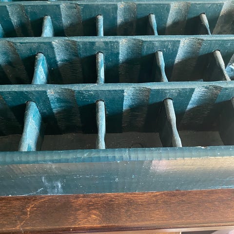 Malet trækasse. Kassen er malet i en blå nuance og dekoreret med blomstermotiv på låget. Forsynet med metalbeslag ved åbningen. Den er ca fra 1910 og lidt skrøbelig, men kan bruges.