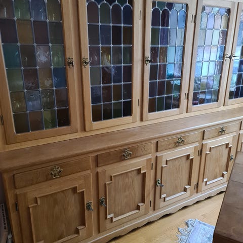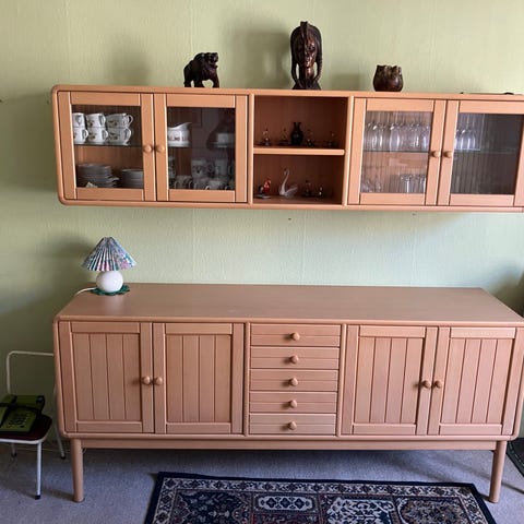 Solid og rummelig skænk samt vitrine/overdel i egetræ med 4 skuffer og 4 låger.
