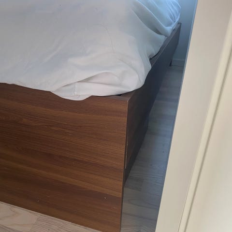Sengen er 3 år gammel, den har et slidmærke, se foto. To af skufferne skal skrues på igen.