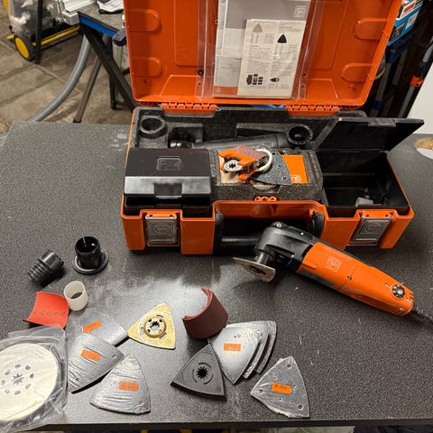 Fein Multimaster multisliber med tilbehør i plastkuffert. Sættet indeholder selve Multimaster-maskinen med ledning, forskellige slibeskiver og slibepapir, samt flere skæreklinger og tilbehørsdele. Der medfølger manual, og indlæg i kufferten har plads til maskine og tilbehør. Velegnet til skæring, slibning og skrabearbejde i træ, metal og andre materialer afhængigt af de anvendte klinger og slibemidler.