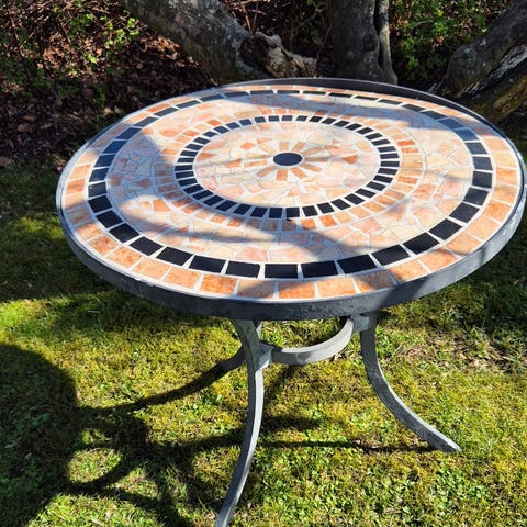 Rundt mosaik bord med bordplade i fliser i forskellige grå og naturfarver. Stel i sortlakeret metal med buede ben. Velegnet som lille cafébord eller sidebord, fx på altan, terrasse eller i haven.