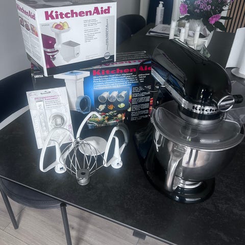KitchenAid Classic røremaskine i hvid med skål i rustfrit stål. Maskinen har vippehoved og hastighedsregulering på siden. Medfølgende tilbehør omfatter piskeris og dejkrog, som ses på billederne. Velegnet til æltning af dej, piskning og blanding af ingredienser i køkkenet.