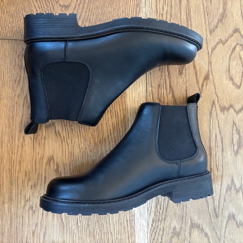 Clarks støvler i str. 45. Chelsea boots støvler i brunt ruskind med elastikpaneler i siderne og trækstrop bagpå. Flad sål og rund snude. Velegnet som hverdagssko i overgangssæsoner.
