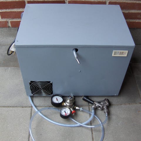 Anlægget kan køre med 4 produkter. Den køler, som den skal. Det er med en manuel termostat. Der følger 2 S koblinger og 1 manometer med fra Micro Matic. Der er sat nye slanger på. Der er et flot tappetårn i blankt stål, med 2 haner, hvor køling går med op til hanerne. Alt er efterset og det er 100% i orden. Mål: 66 cm høj -39 cm bred-39 cm dyb.