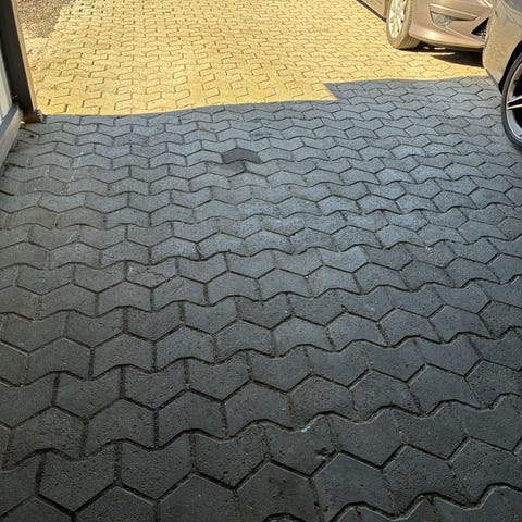 Beton belægningssten i rektangulær form. Stenene fremstår i en blanding af grå og røde nuancer med synlige sten- og gruspartikler i overfladen. Velegnet til fx indkørsel, terrasse eller gangarealer. Leveres som løse sten stablet på plads, klar til afhentning og videre brug i udendørs belægning.