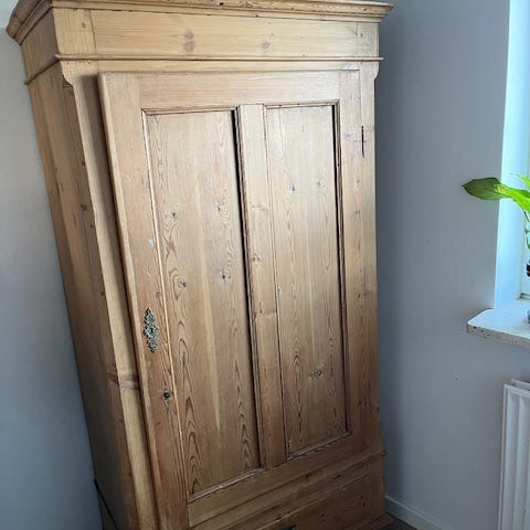 Vi har et meget fint antikt istandsat karlekammerskab som vi desværre må af med. Købt for 3000,- for 1,5 år siden, vi skal af med det fordi vi er flyttet. Derfor den lave pris: 1500,- D: 38 h: 170 b: 85