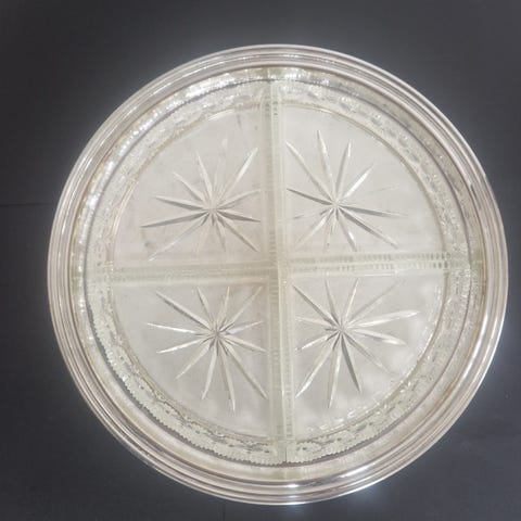 forsølvet fad med glasdelene påsat
