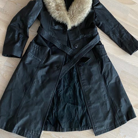 Vintage frakke i læder til damer i str. 38. Frakken er grøn med matchende for og har klassisk krave, knaplukning foran samt lommer. Længden går omtrent til midt på låret, hvilket gør den egnet som overgangsfrakke eller yderlag på køligere dage. Materialet er glat læder, og pasformen er figursyet med lange ærmer.