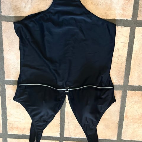 Badedragten er blå- og hvidstribet og fremstillet i polyester. Klassisk model med brede stropper og rund udskæring for og bag.