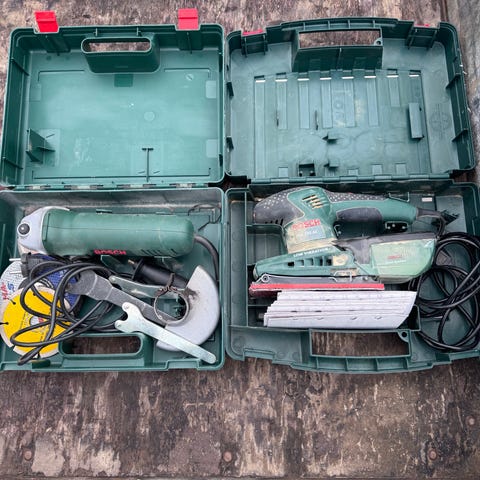 Bosch elværktøj sæt med flere ledningsdrevne maskiner. Sættet omfatter blandt andet en vinkelsliber, en overfræser og en boremaskine/skruemaskine. Alle maskiner er med netkabel. Velegnet til forskellige typer slibe-, bore- og fræseopgaver i værksted eller hjemmeprojekt.