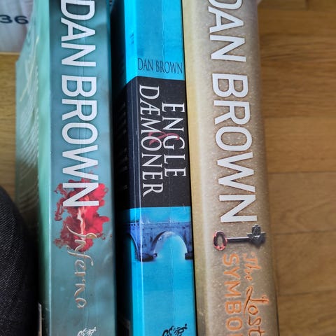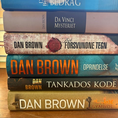 Dan Brown bogsæt bestående af 4 bind på dansk. Sættet indeholder titlerne "Da Vinci mysteriet", "Vankados kode", "Engle og dæmoner" og "Morderisk bedrag". Bøgerne er indbundne udgaver med hardback-omslag. Velegnet til læsere af spændings- og thrillerromaner samt samlere af Dan Browns forfatterskab. Samlet 65 kr eller pr. stk.
